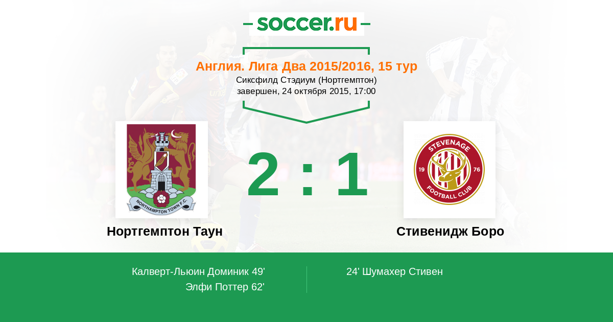 | Стивенидж Боро | 21:29 | 17:15 | 4:14 |