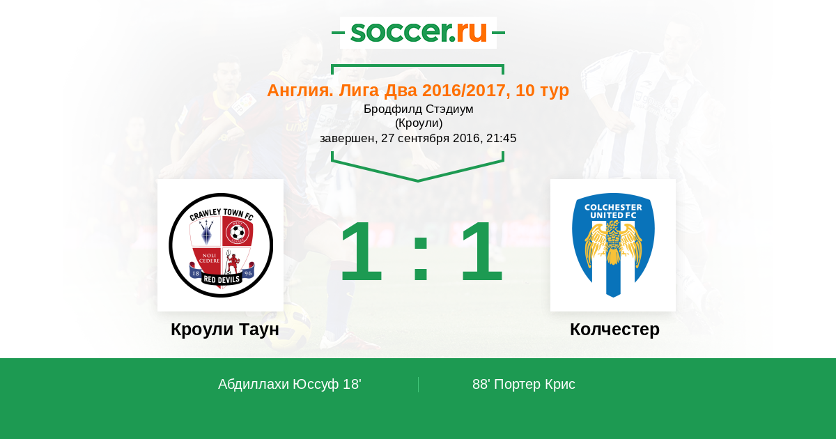 | Кроули Таун | 34:28 | 17:11 | 17:17 |