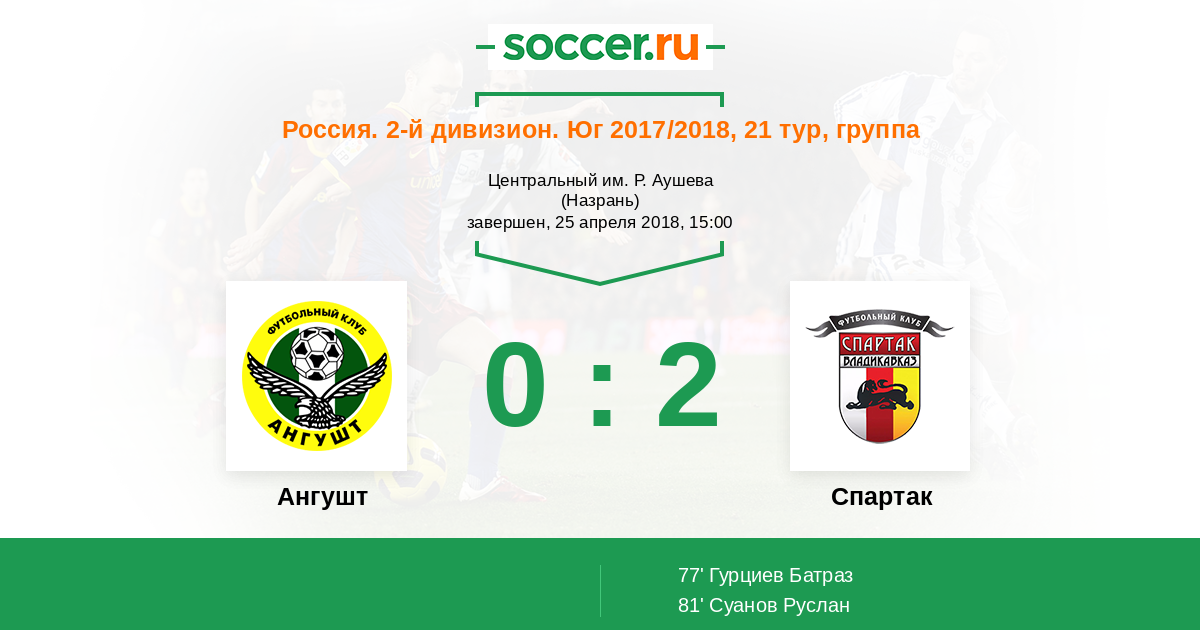 | Ангушт | 6:4 | 3:0 | 3:4 |