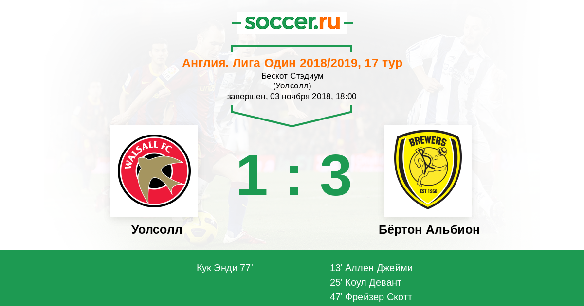 | Уолсолл | 4:1 | 2:0 | 2:1 |