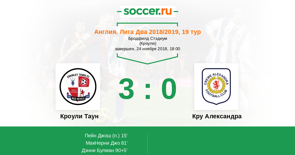 | Кроули Таун | 18:35 | 13:17 | 5:18 |