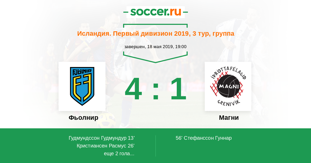 | Фьолнир | 3:1 | 0:0 | 3:1 |