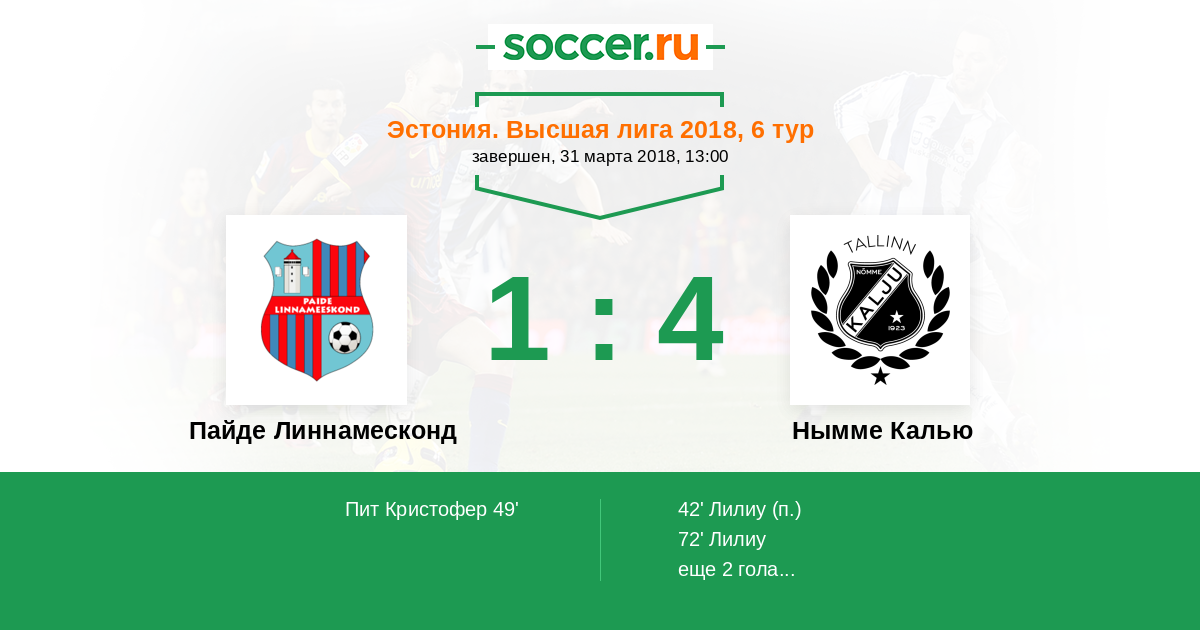 | Пайде Линнамесконд | 71:126 | 38:74 | 33:52 |