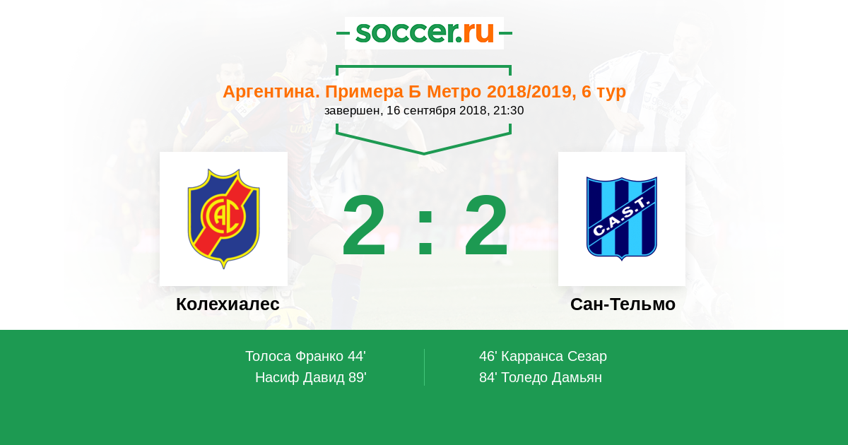 | Аргентина. Примера Б Метро | 19 | 5 | 8 | 6 |