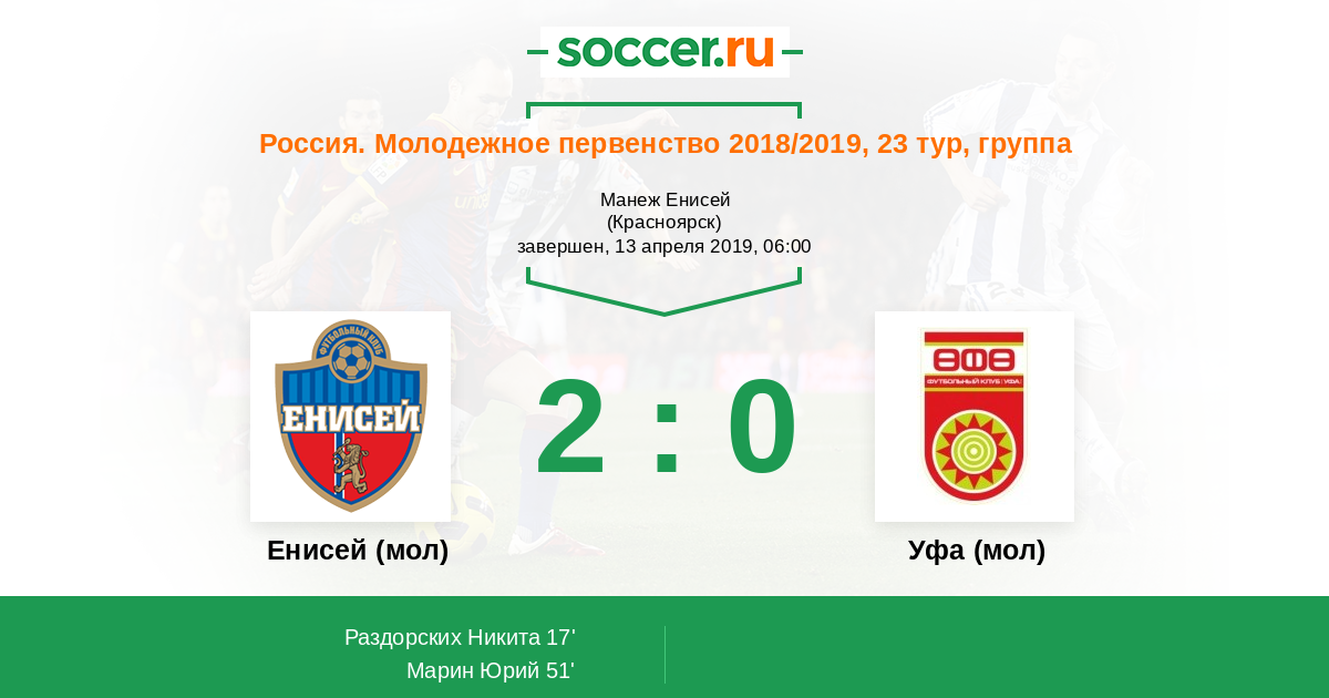 | Енисей (мол) | 3:0 | 0:0 | 3:0 |