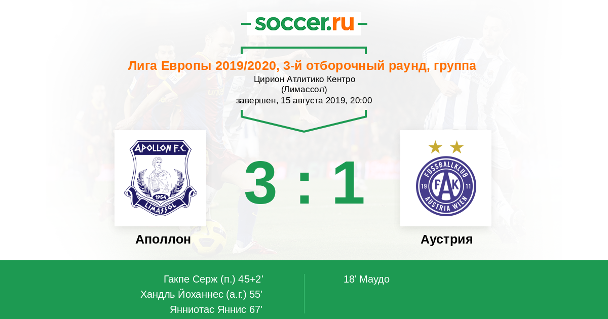 | Аполлон | 2:1 | 0:0 | 2:1 |