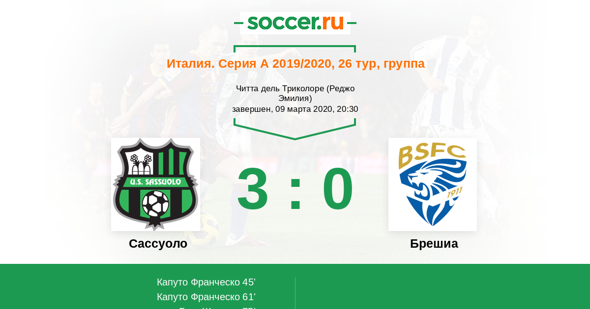 | Сассуоло | 17:15 | 4:4 | 13:11 |