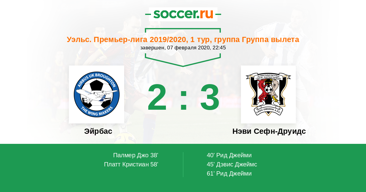 | Нэви Сефн-Друидс | 38:30 | 19:12 | 19:18 |