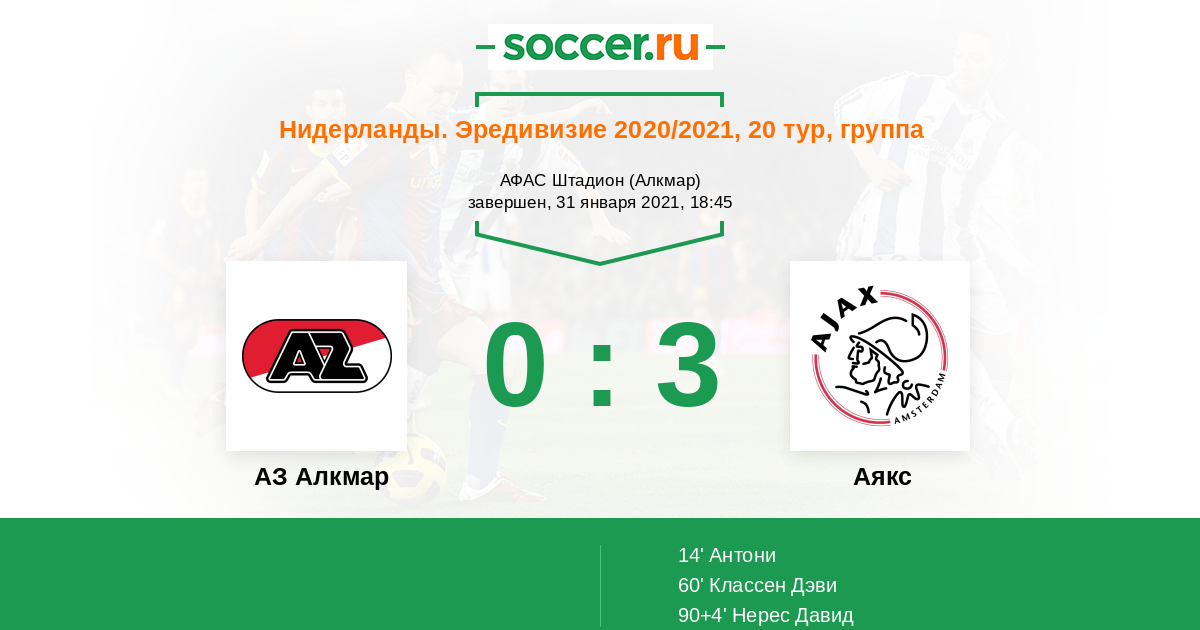 В четырех прошлых турах лиги «Аякс» набрал максимум очков. «Евреи» поочередно обыграли «Твенте» (3:1), «Фейеноорд» (1:0), «Фортуну» (2:1) и «Виллем II» (3:1). Кадровых проблем в составе гостей предстоящего матча не просматривается. У Душана Тадича 10 голов за 19 игр. 20 января «Аякс» успешно сыграл в Алкмаре, обыграв соперника в поединка на Кубок Нидерландов. В той встрече «евреи» доминировали над хозяевами, которые в прошлом туре вновь провалились.