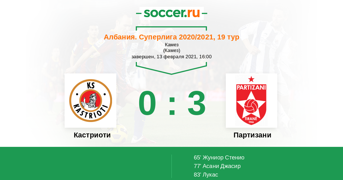 | Албания. Суперлига | 25 | 3 | 16 | 6 |