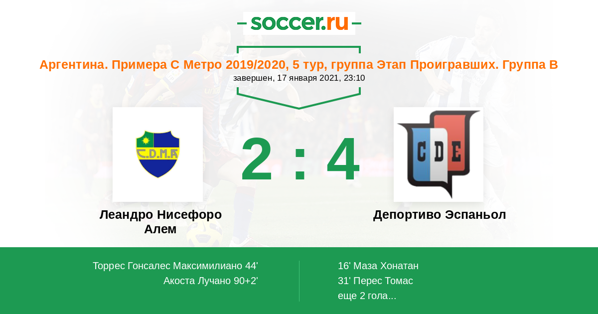 | Аргентина. Примера С Метро | 15 | 8 | 4 | 3 |