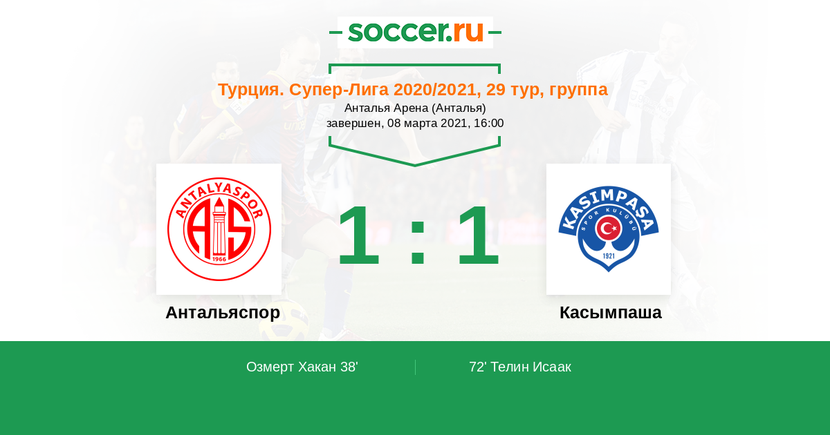 | Антальяспор | 45:37 | 22:12 | 23:25 |
