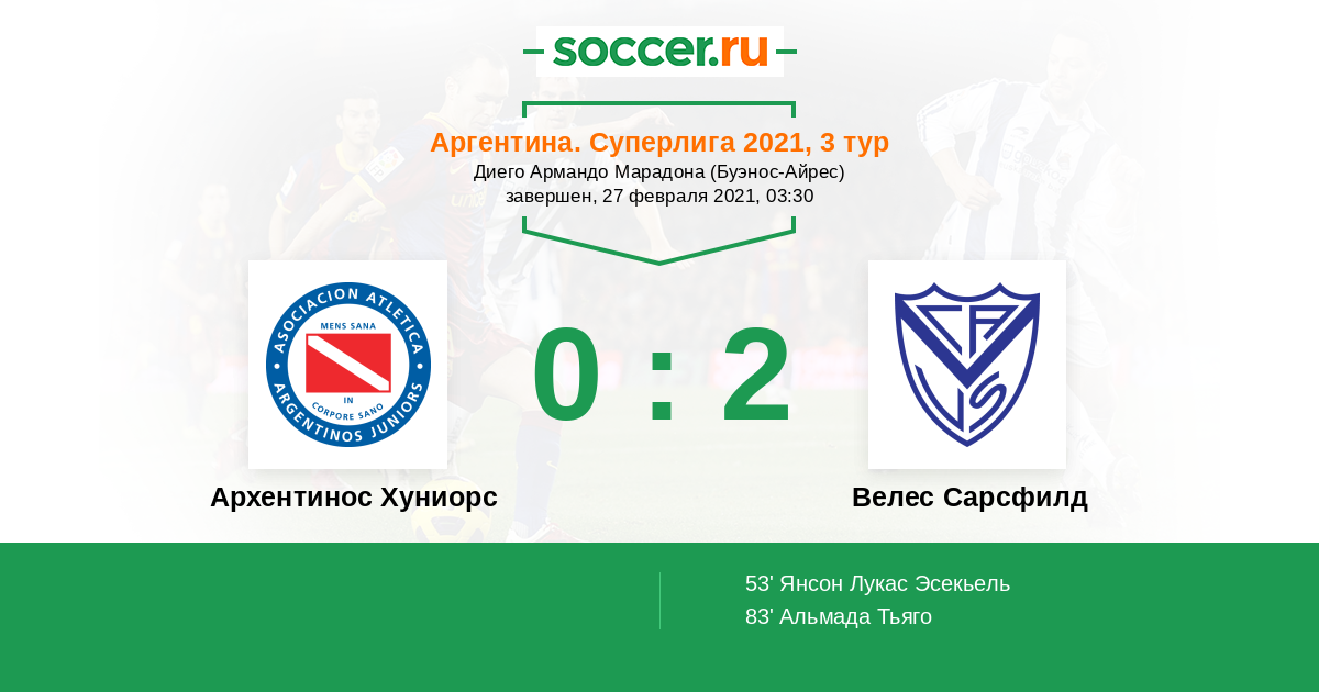 | Велес Сарсфилд | 45:34 | 27:16 | 18:18 |