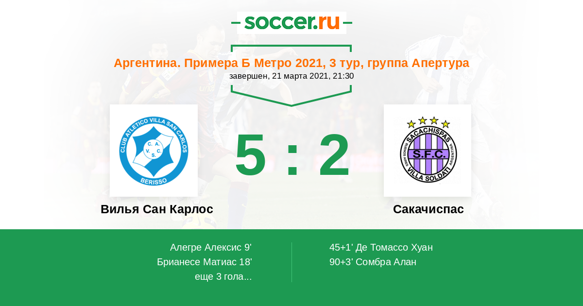 | Аргентина. Примера С Метро | 6 | 3 | 1 | 2 |