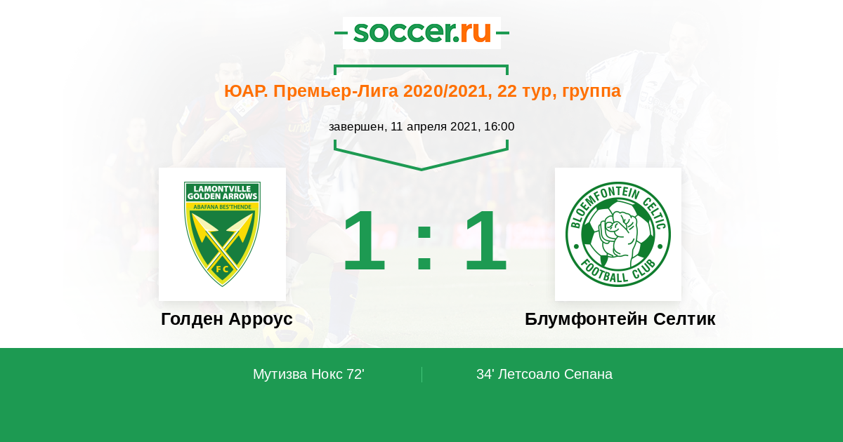 | Блумфонтейн Селтик | 41:21 | 25:11 | 16:10 |