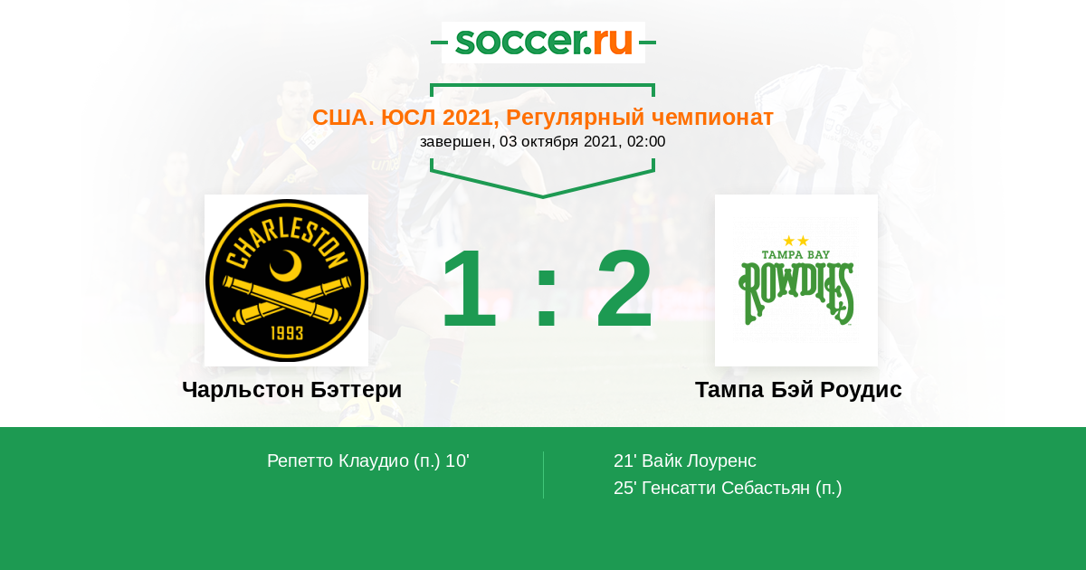 | Чарльстон Бэттери | 34:31 | 18:10 | 16:21 |