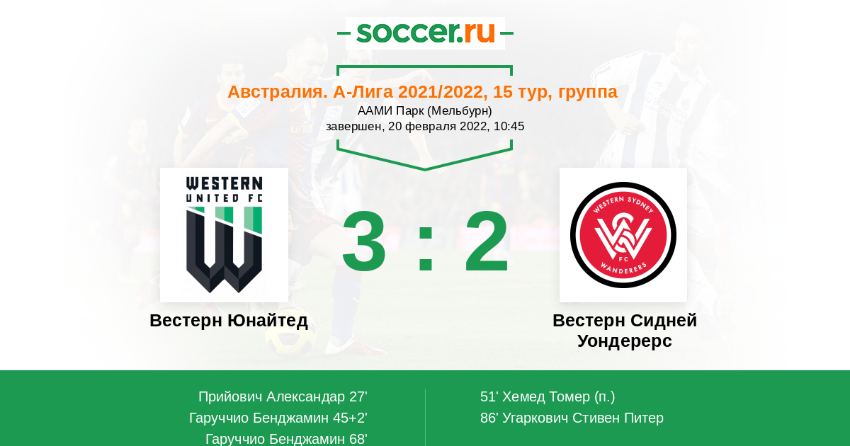 | Вестерн Сидней Уондерерс | 22:14 | 15:5 | 7:9 |