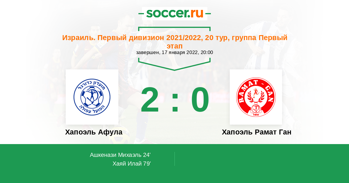 | Хапоэль Афула | 35:42 | 22:18 | 13:24 |