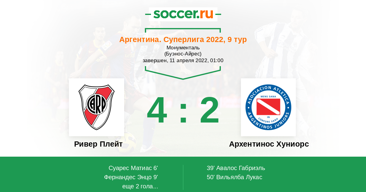 | Ривер Плейт | 22:14 | 10:6 | 12:8 |