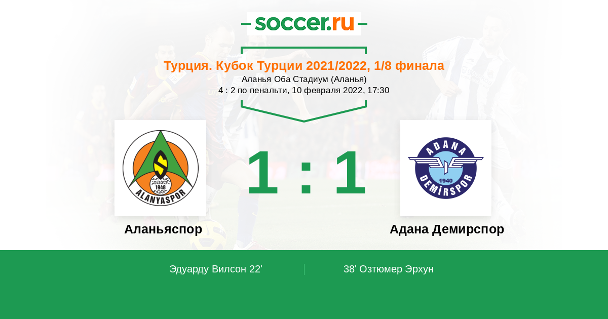 | Адана Демирспор | 38:25 | 20:11 | 18:14 |