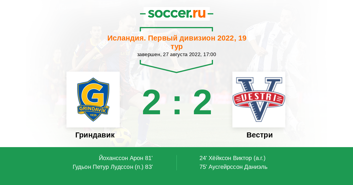 | Гриндавик | 13:10 | 4:4 | 9:6 |