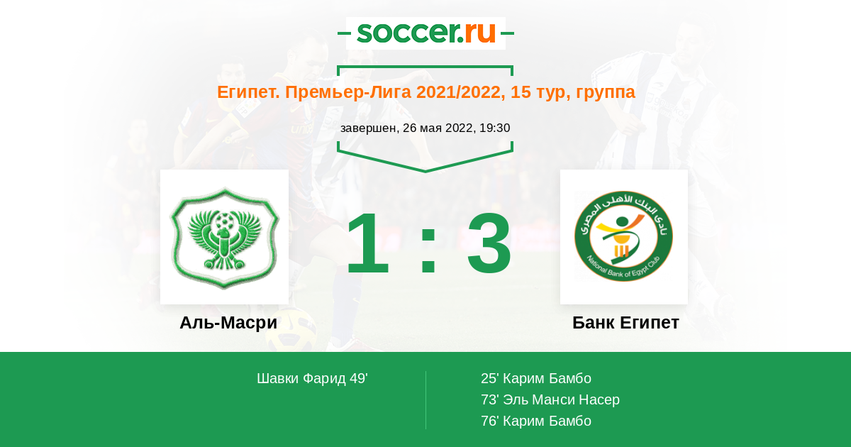 | Банк Египет | 13:6 | 9:6 | 4:0 |