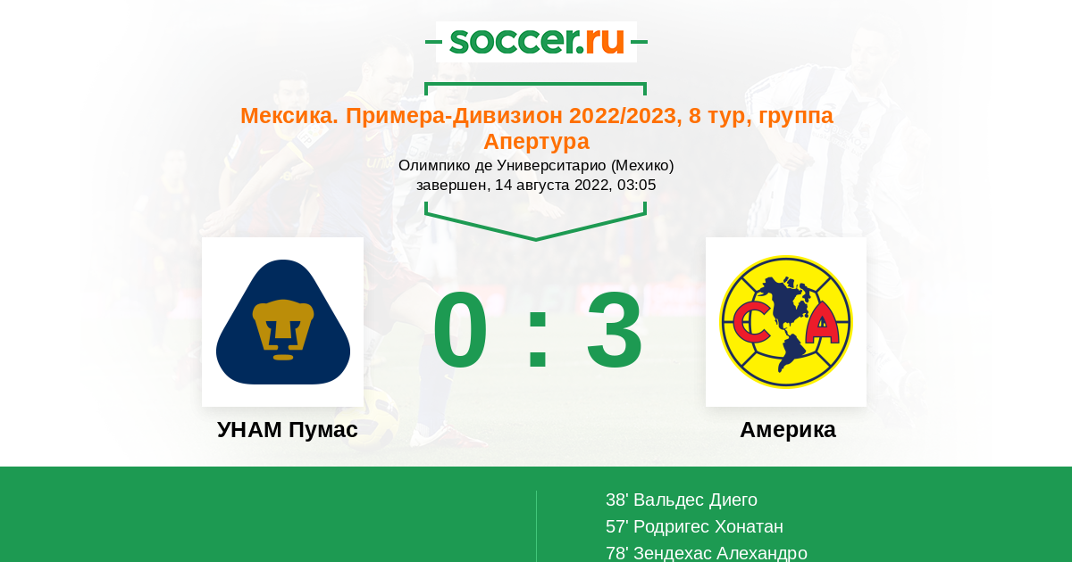 | УНАМ Пумас | 62:83 | 28:41 | 34:42 |