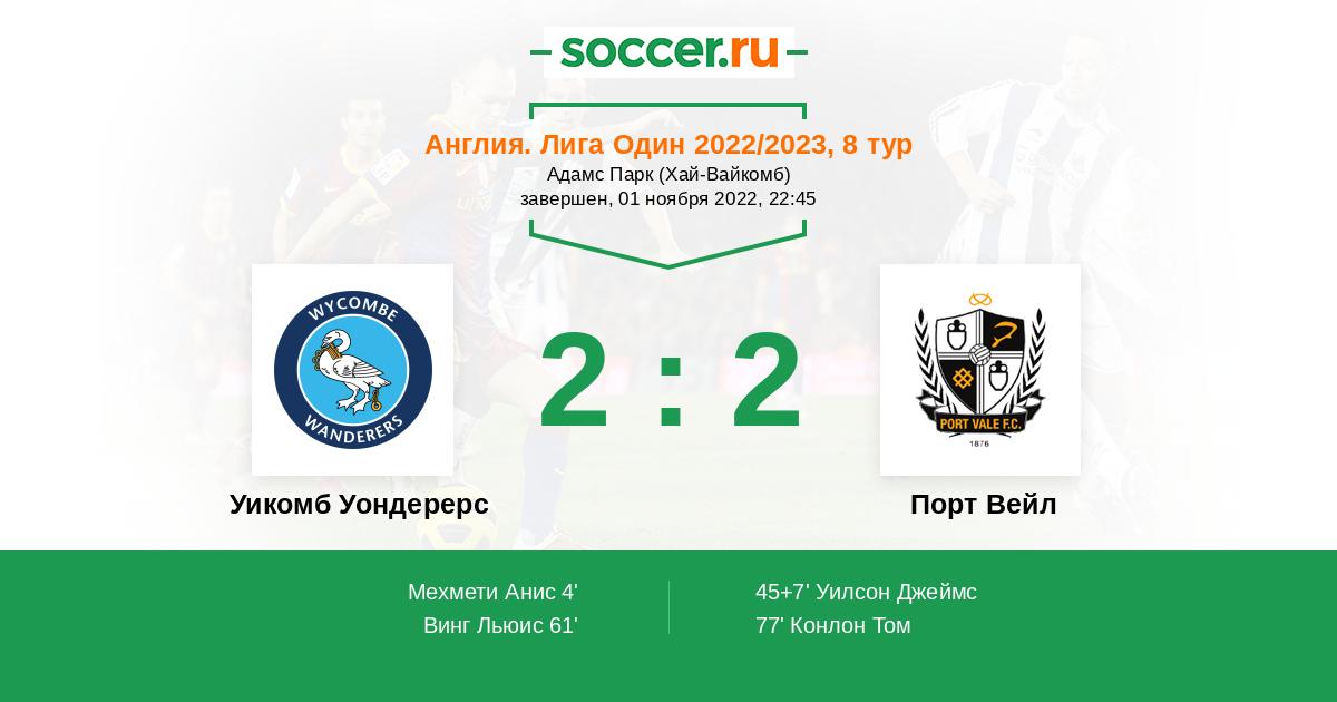| Уикомб Уондерерс | 9:4 | 1:1 | 8:3 |