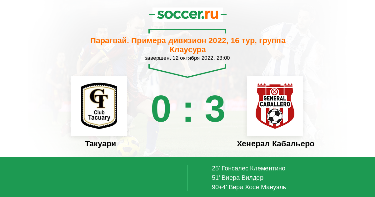| Хенерал Кабальеро | 34:39 | 19:15 | 15:24 |