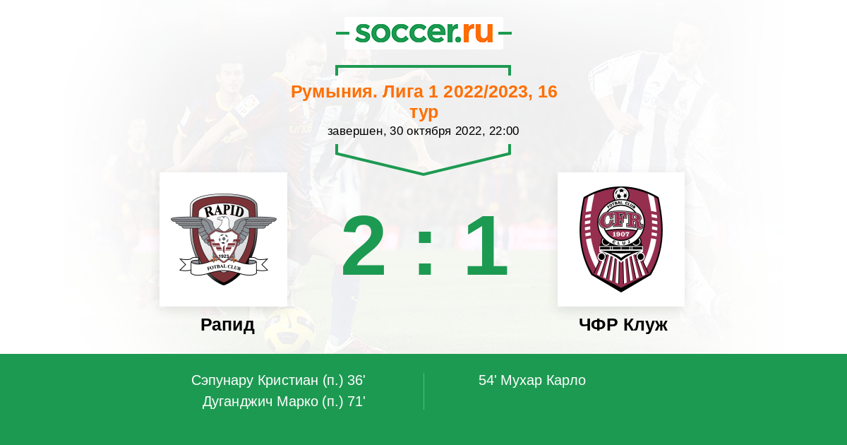 | ЧФР Клуж | 45:50 | 22:21 | 23:29 |