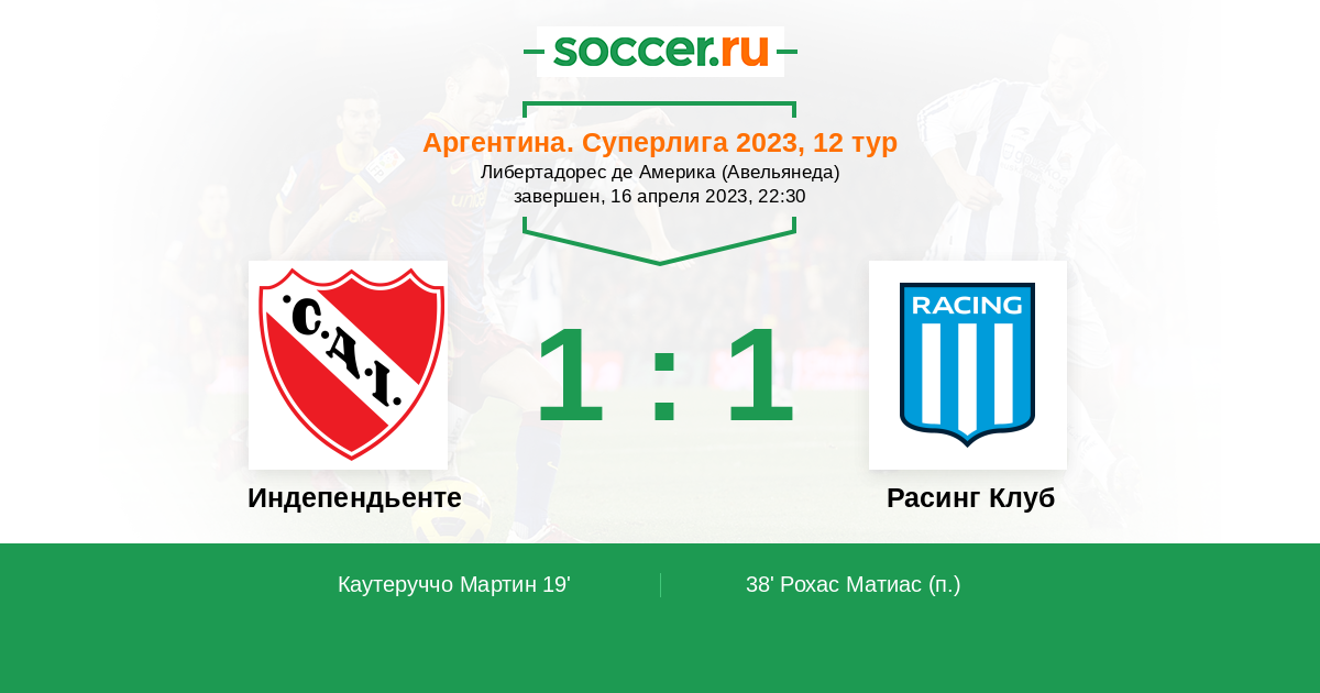 | Индепендьенте | 56:41 | 34:19 | 22:22 |