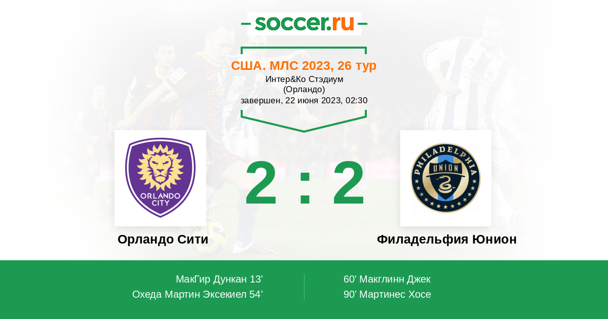 | Орландо Сити | 37:46 | 19:21 | 18:25 |