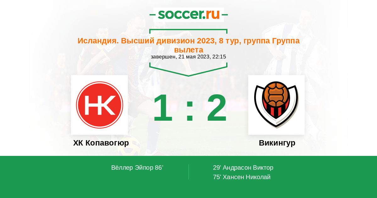 | Викингур | 37:17 | 23:6 | 14:11 |