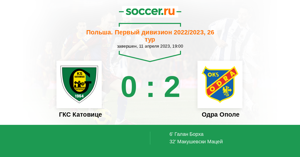 | ГКС Катовице | 21:18 | 10:9 | 11:9 |