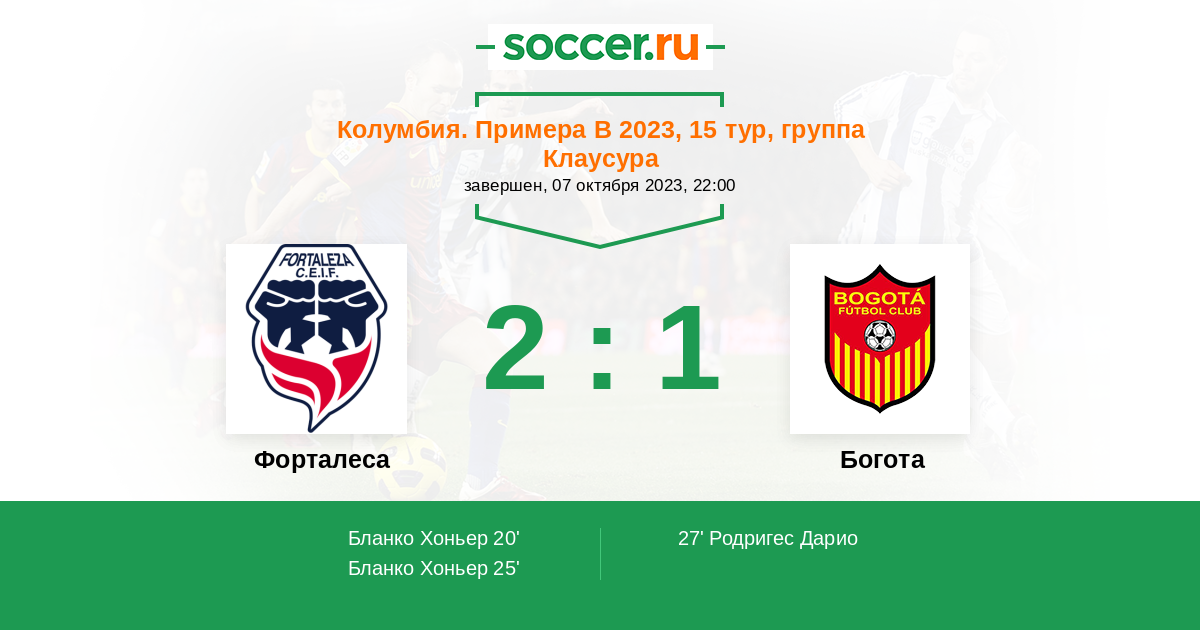 | Колумбия. Примера B | 22 | 10 | 5 | 7 |