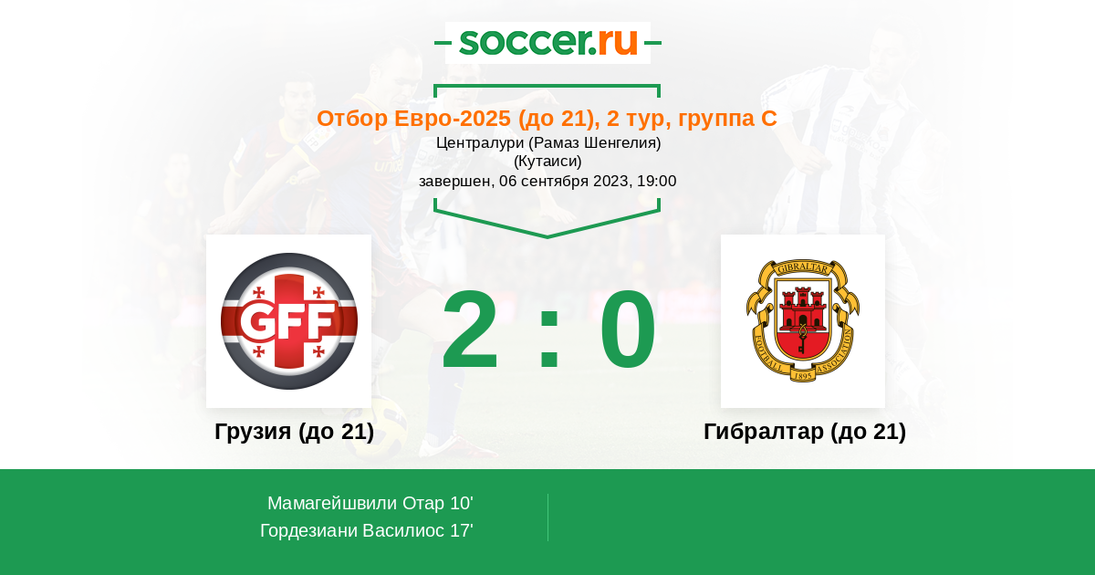 | Грузия (до 21) | 2:0 | 0:0 | 2:0 |