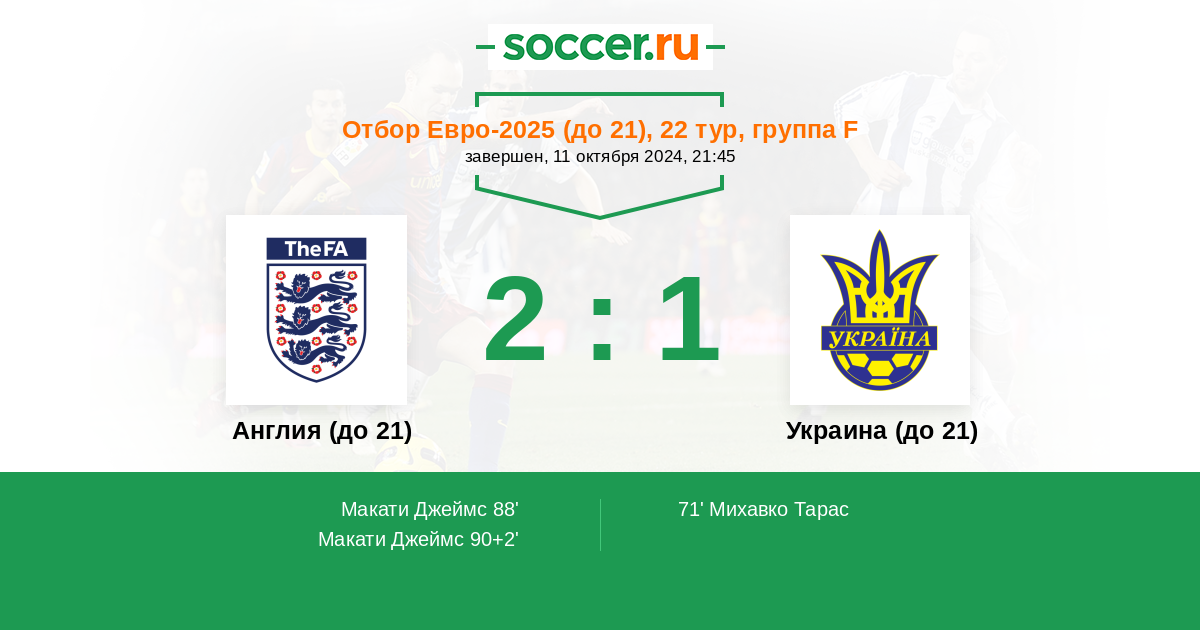 | Англия (до 21) | 6:4 | 2:1 | 4:3 |