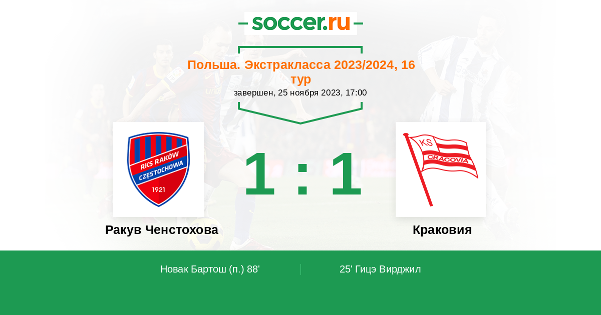 | Краковия | 20:10 | 14:4 | 6:6 |