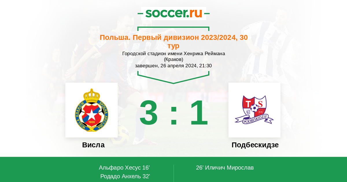 | Висла | 33:24 | 11:11 | 22:13 |