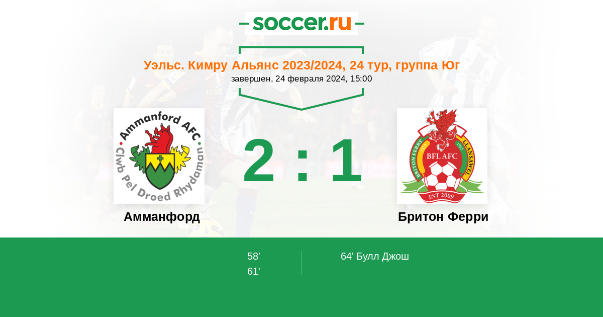 | Амманфорд | 10:20 | 6:9 | 4:11 |