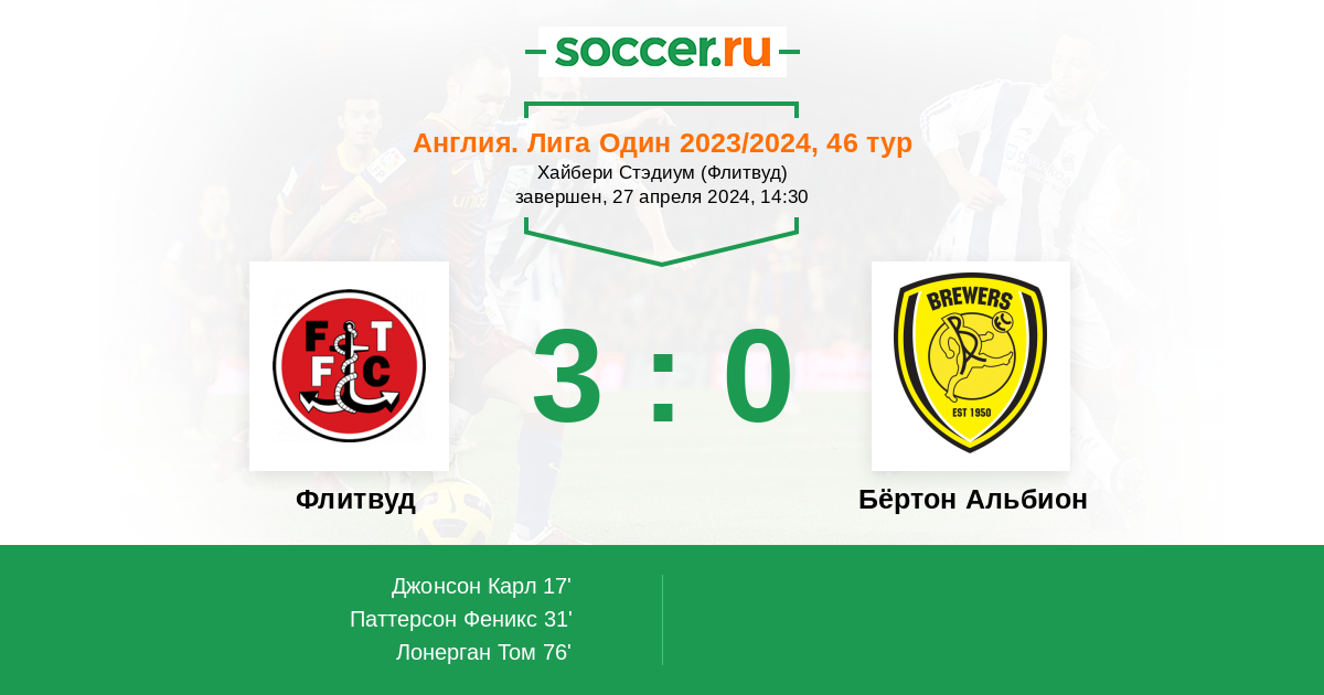 | Флитвуд | 32:33 | 18:17 | 14:16 |