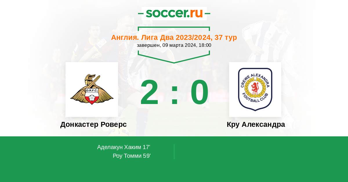 | Донкастер Роверс | 43:41 | 20:16 | 23:25 |