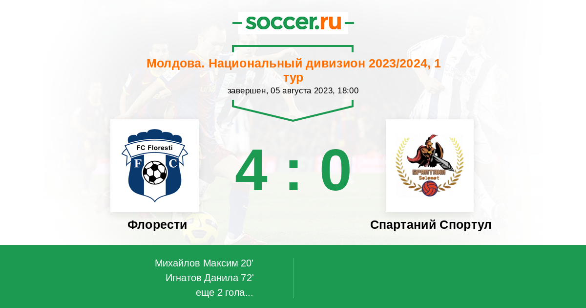 | Флорести | 8:4 | 3:0 | 5:4 |