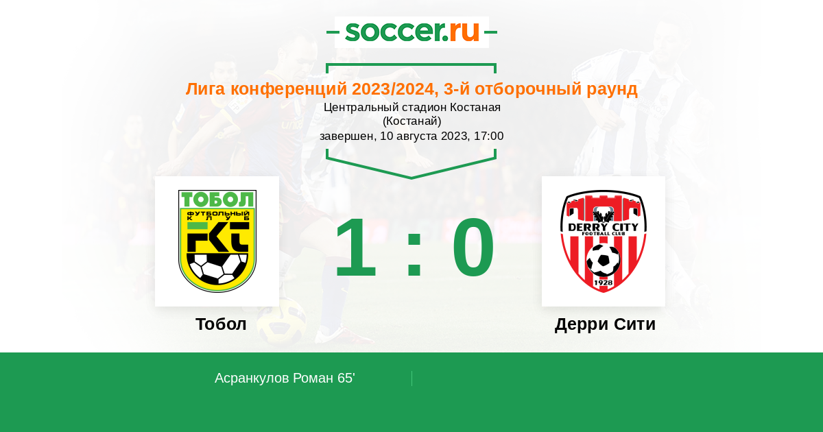 | Тобол | Дерри Сити | |