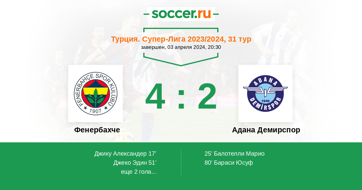 | Адана Демирспор | 6:26 | 2:11 | 4:15 |