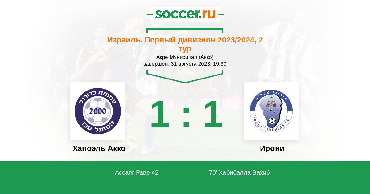 | Хапоэль Акко | 5:3 | 0:1 | 5:2 |