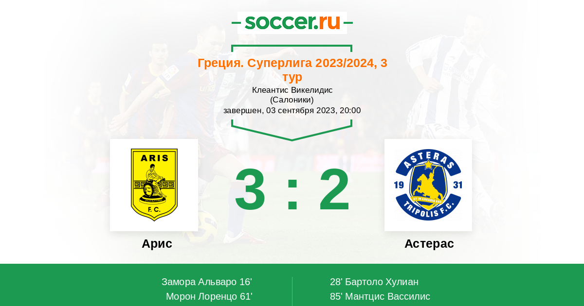 | Арис | 57:34 | 33:14 | 24:20 |
