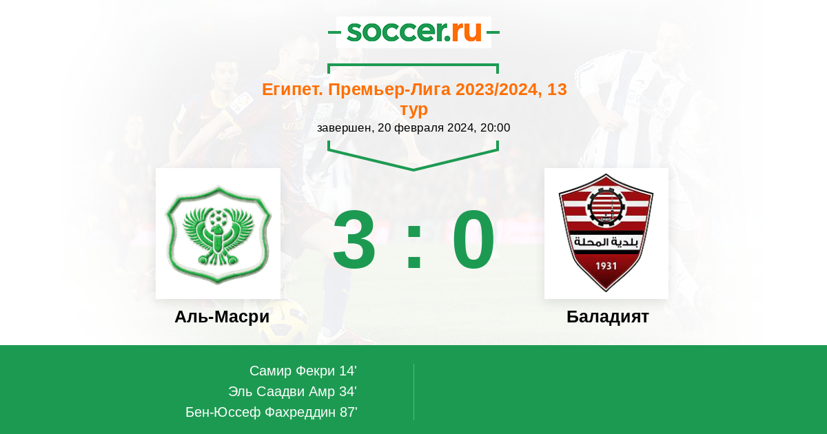 | Аль-Масри | 1:0 | 0:0 | 1:0 |