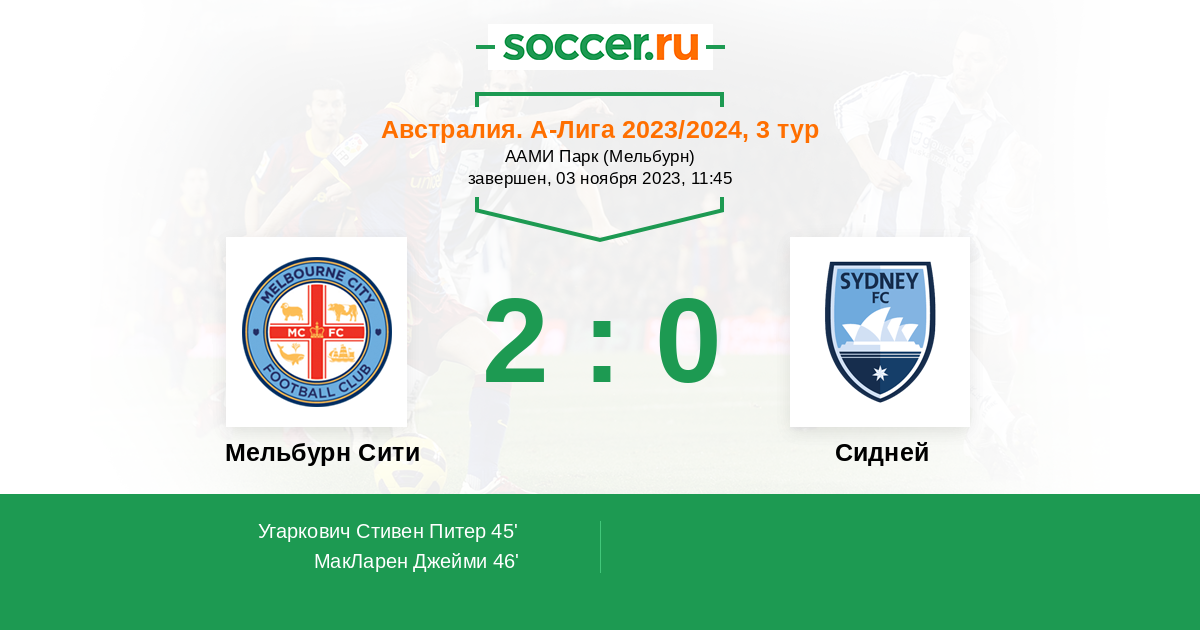 | Мельбурн Сити | 66:55 | 41:30 | 25:25 |