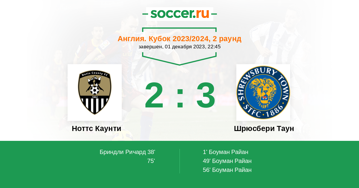 | Ноттс Каунти | 7:5 | 4:1 | 3:4 |